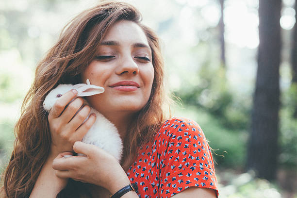 Beautiful and cute young woman holding a little white bunny and looking at camera posing at forest